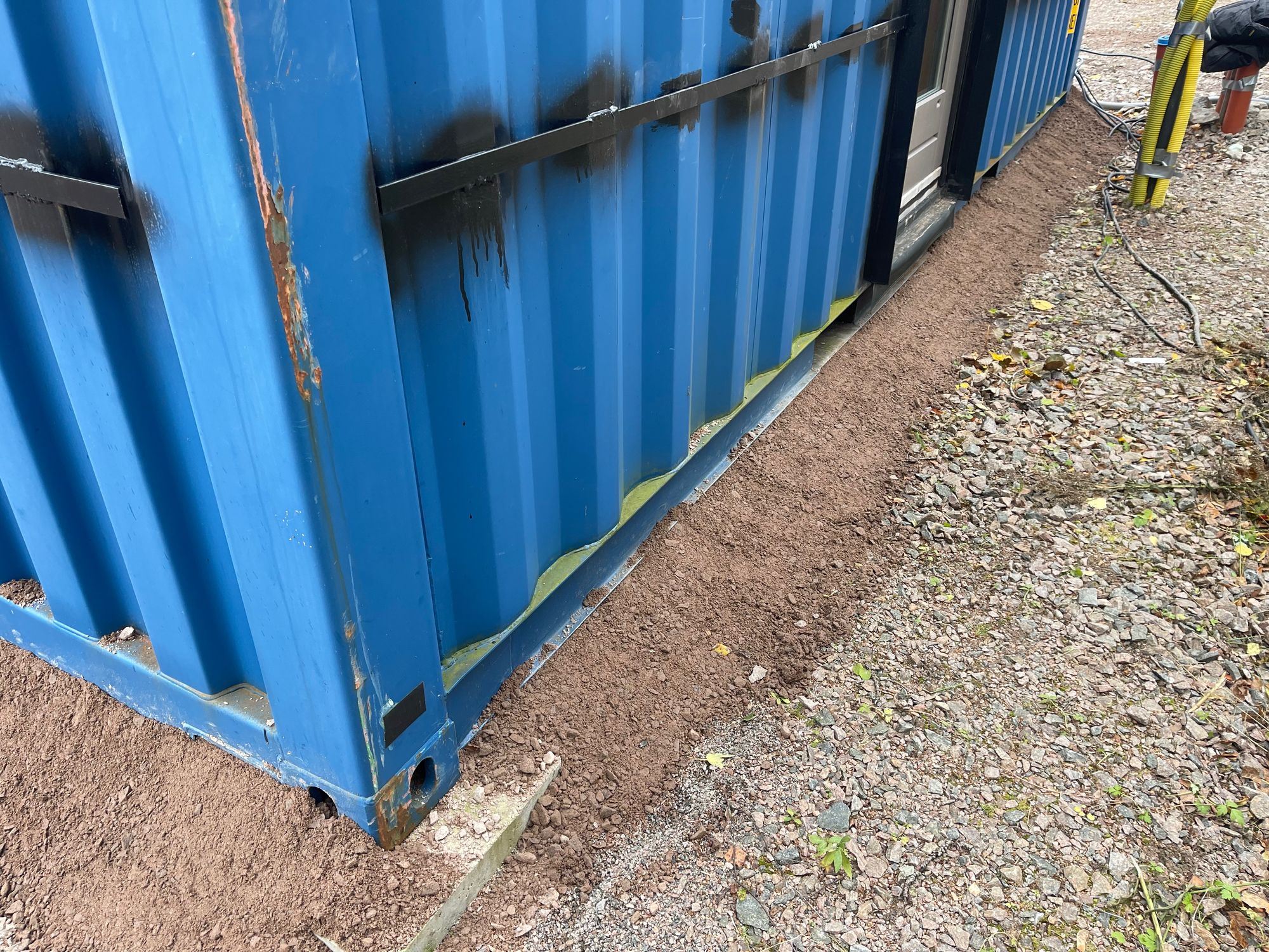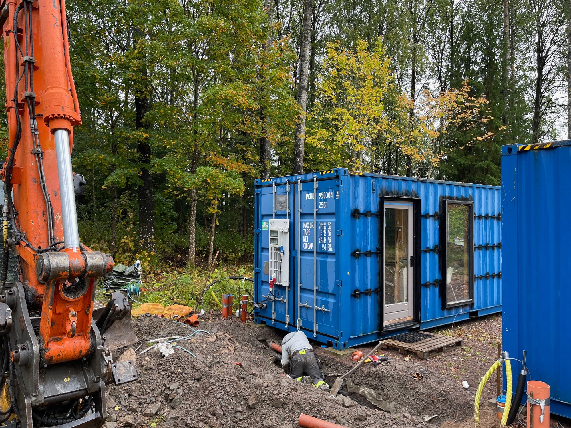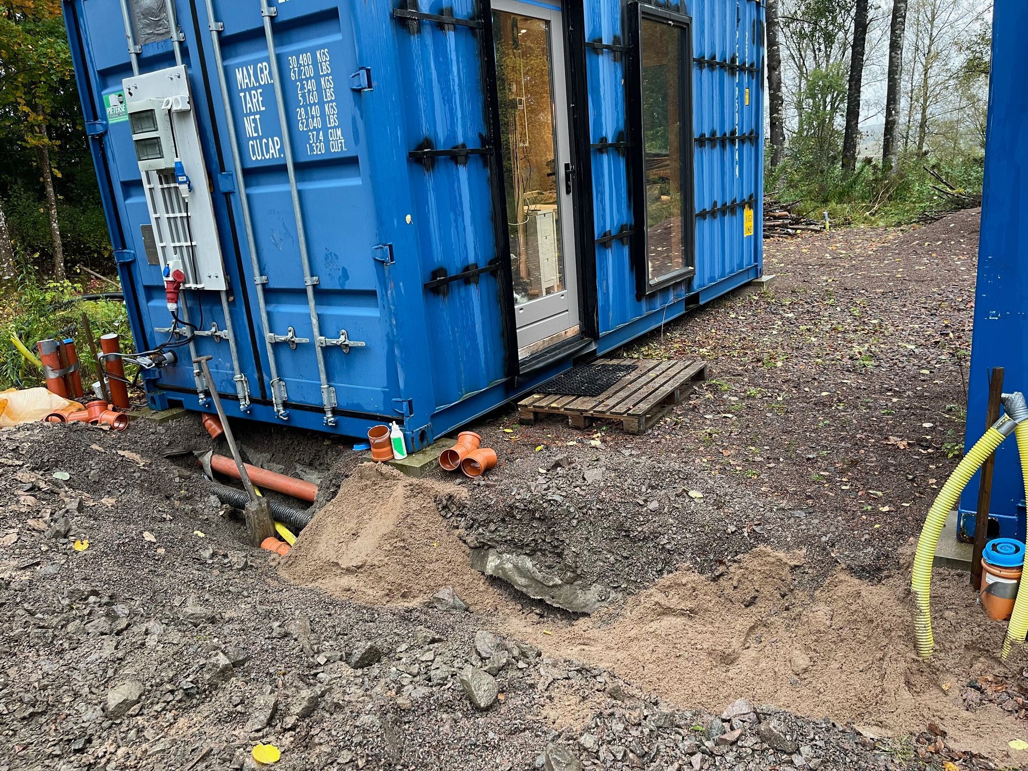- Een 40 ft container die we gelijk op de juiste plek zetten en die in de toekomst als woon- en werkkamer gaat dienen en die we voor nu als opslag kunnen gebruiken.