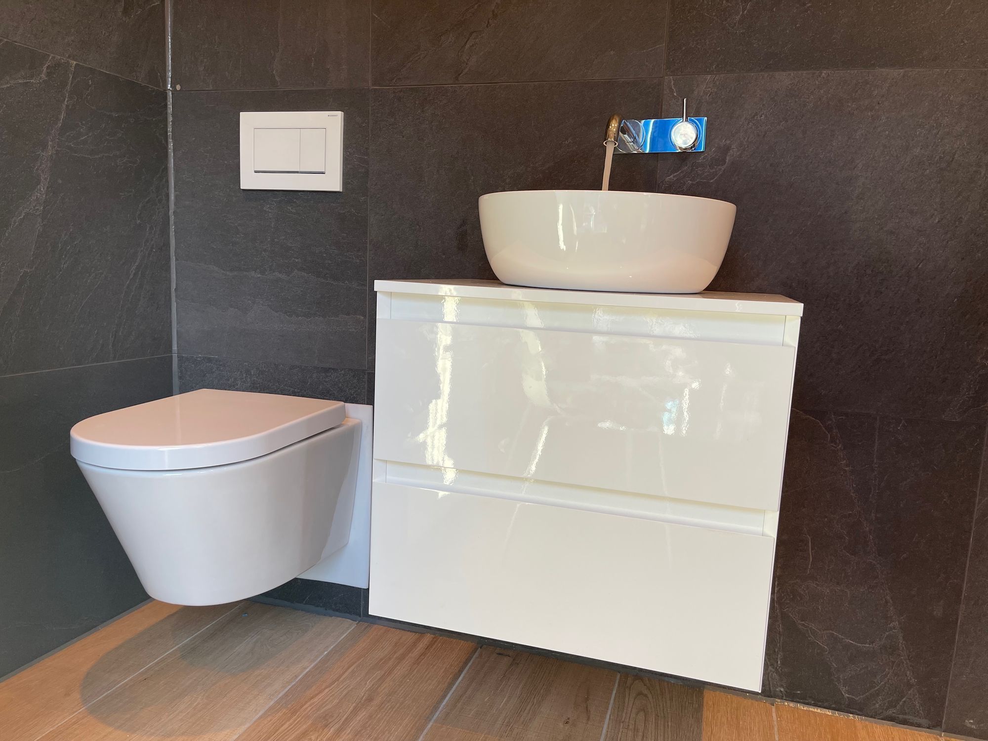 Na een tijdje merken we dat de vloer niet warm wordt. Wat blijkt, de stop in de meterkast in de container is eruit gesprongen en ook die van de meterkast buiten. Remco heeft het aansluitfoutje snel gevonden en probeert het opnieuw. En ditmaal gaat het wel goed. Binnen een uur is de temperatuur van de vloertegels van 12 graden naar ruim 20 graden gestegen. Kun je voorstellen wat een feest dat is als je de badkamer inloopt? Daar waar de vloer in de slaapkamer comfortabel aanvoelt omdat het hout is, was dit in de badkmer wel anders. Maar nu...... doe je met plezier je schoenen uit als je naar het toilet of de wastafel gaat!