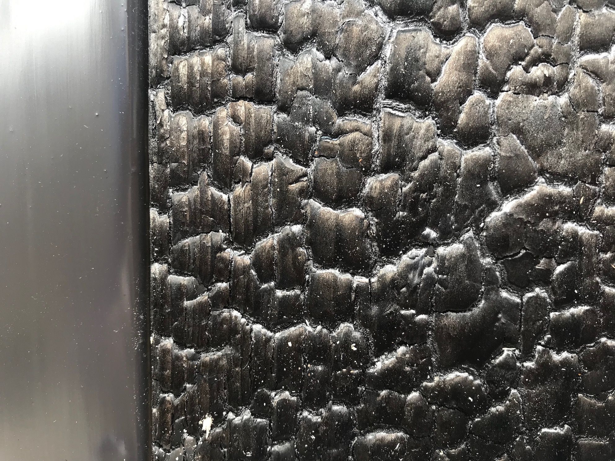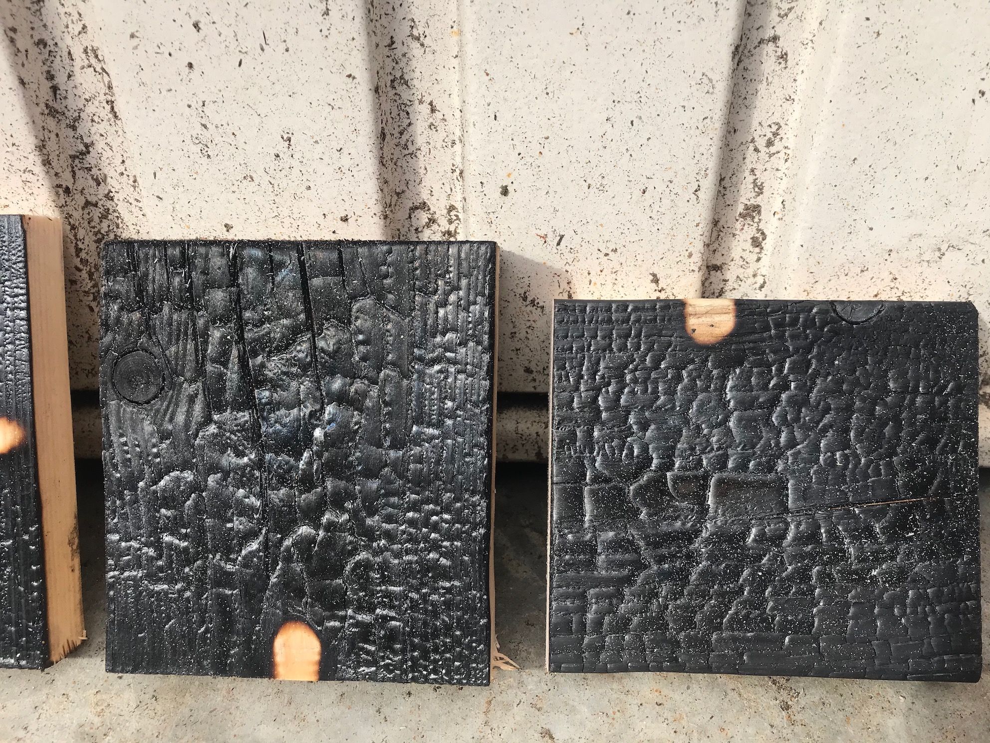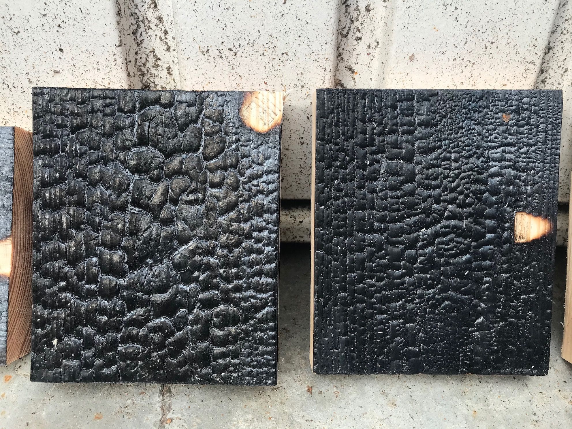 De bovenste rij foto's zie je de verschillende gradaties van verbranding. De foto waarop je een soort van "krokodillenhuid" ziet, is veel intenser "gebrand" dan de meer gladde variant. Op de onderste twee foto's houden we de twee uitersten (diep verbrand en licht verbrand) naast het kozijn om een beeld te krijgen hoe dit er in het geheel uit zal gaan zien.